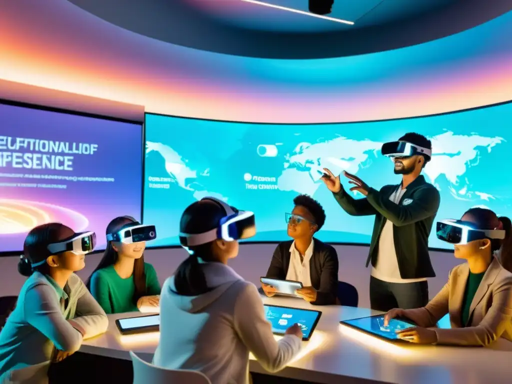 Estudiantes diversos interactúan con objetos virtuales usando auriculares de Realidad Aumentada en un aula futurista